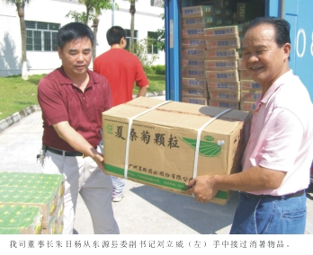 2009年8月18日,在東源縣縣委副書記劉立威的帶領下,東源縣總工會“關愛健康,送清涼”行動小組為我司送上了菊花茶、夏桑菊等一批消暑降溫物品。行動小組受到了我司董事長朱日楊等人的熱情接待,朱董事長認為,“送清涼”行動充分體現了上級領導部門對企業員工貼心的關懷,并代表全體‘霸王花’人對此表示衷心地感謝。